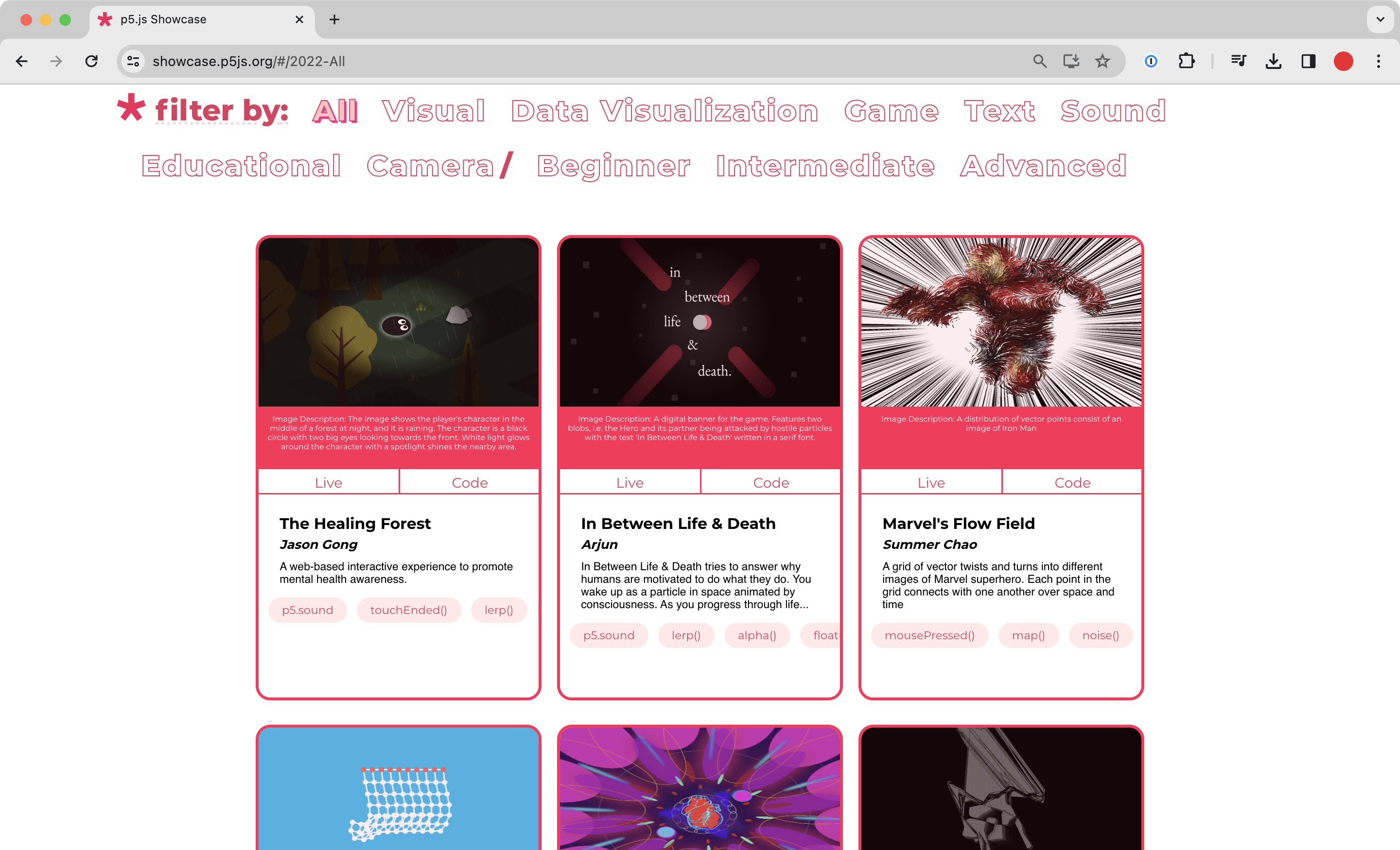 Using the metaphor of a sketch, p5.js has a full set of drawing functionality. However, you’re not limited to your drawing canvas. You can think of your whole browser page as your sketch, including HTML5 objects for text, input, video, webcam, and sound.